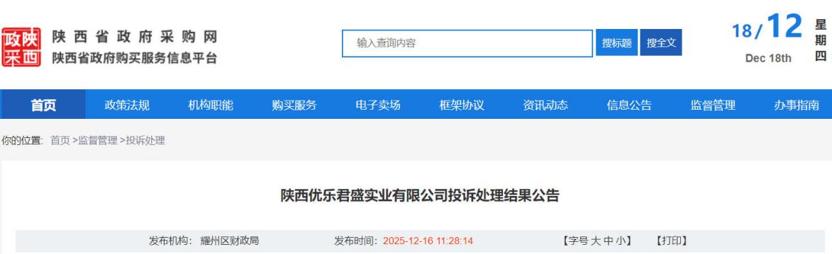 公告显示,投诉方陕西优乐君盛实业有限公司认为,中标供应商铜川市可人酒店服务有限公司在投标文件中存在三项问题:中小企业声明函中行业划分不实、从业人数填报虚假,以及历史业绩涉嫌造假。