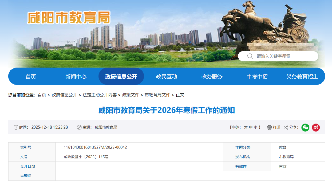12月18日,咸阳市教育局发布关于2026年寒假工作的通知: