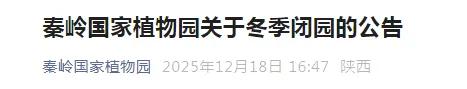 12月18日,秦岭国家植物园发布冬季闭园公告。受冬季天气降温影响,园区内道路结冰湿滑。为保障游客安全,该园将于2025年12月22日至2026年1月31日闭园。