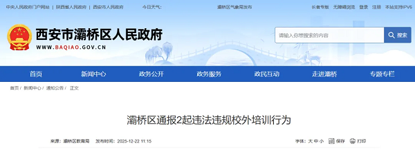 为贯彻落实陕西省、西安市关于进一步加强校外培训治理工作要求,持续深化“双减”工作成效,切实减轻中小学生校外培训负担,12月22日,灞桥区教育局通报2起违法违规校外培训行为。