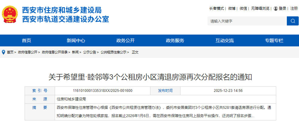 报名工作完全在线上进行。凡已取得西安市本级公租房实物配租资格、目前仍符合条件且轮候时间在2025年12月23日之前的家庭,可在2026年1月6日前,登录西安市保障性住房网上服务平台完成报名。报名先后顺序不影响最终分配结果,系统将根据家庭情况(如功臣模范、低保、残疾、多子女等)进行综合排序,并依次组织选房。