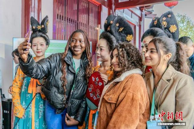 河南洛阳,身穿特色服饰的工作人员吸引外宾合影