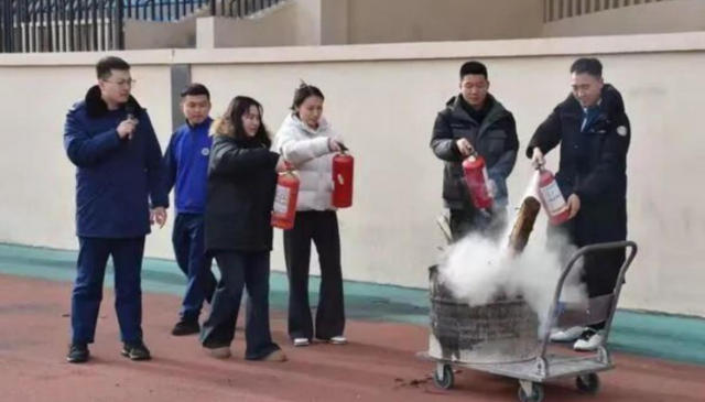 演练还特别设置灭火器实操环节。隆帆副校长与拓壮壮教官现场讲解干粉灭火器的构造、适用范围及“提、拔、瞄、压”操作口诀,并进行示范。随后,教师代表依次上前,对模拟火源进行规范扑灭,切实掌握初期火灾应对技能。