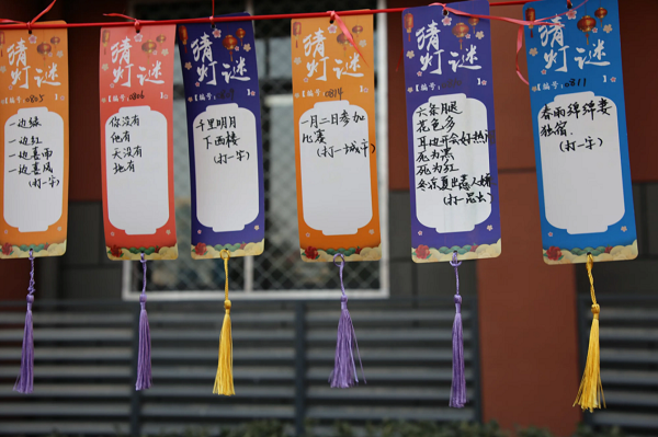 活动现场布置简洁而喜庆,五彩斑斓的字谜卡片整齐悬挂,迎风轻扬,成为校园里一道靓丽的风景线。卡片上的谜题兼具趣味性与知识性,涵盖字谜、成语谜、俗语谜等多个类别,难易兼具,既贴合传统文化内涵,又融入生活常识,吸引了众多师生驻足思索。
