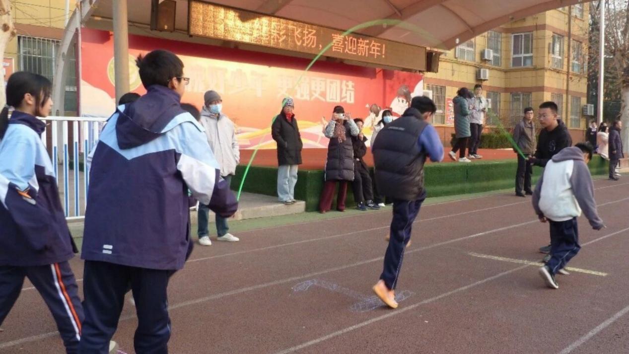 当日下午,操场变身欢乐赛场。冬季跳大绳比赛中,七年级至高二年级22个班级的“绳”采少年齐聚。各班12人组成团队,2人摇绳、10人跳绳,3分钟内比拼累计次数与失误控制。赛前,体育委员自发组织训练,班主任化身“教练”指导“8字型”走位;赛中,彩绳翻飞如虹,健儿跃动似龙,呐喊声与欢笑声交织。政教处巨刚主任表示:“跳绳不仅锻炼心肺功能与协调性,更培养了规则意识、抗挫能力与团队精神,为冬日校园增添活力。”