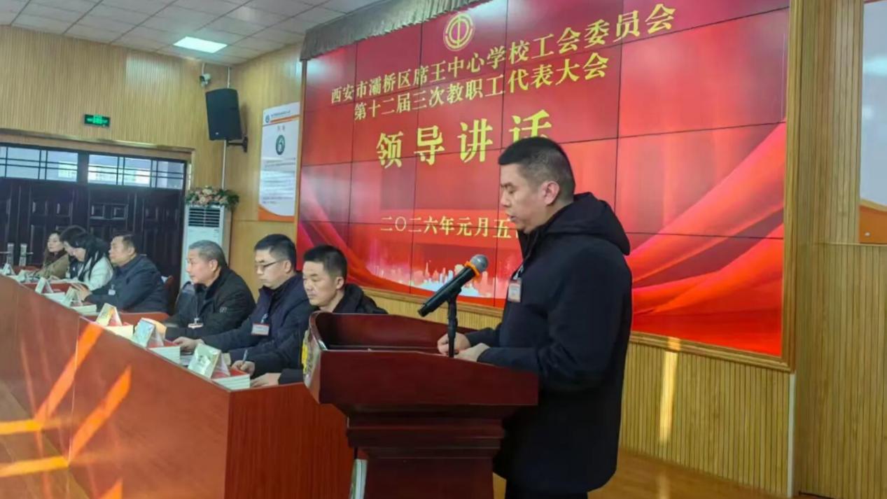 2026年1月5日,西安市灞桥区席王中心学校第十二届教职工代表大会第三次会议在东城六小多功能厅召开。本次大会以“凝心聚力促实干,守正创新谋发展”为主题,来自灞桥区席王中心校党总支领导班子、工会委员及辖区6所校园的正式代表、列席代表共125人齐聚一堂,共商学校发展大计。会议由校工会副主席刘元杰主持。