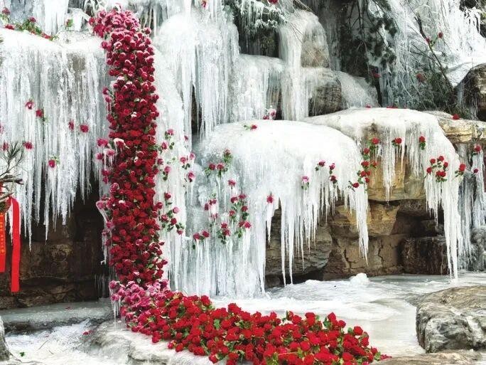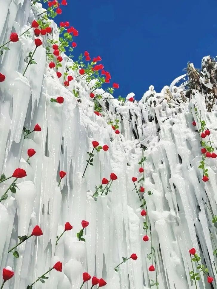 步入现场,只见在嶙峋的冰柱与层叠的冰挂之间,一朵朵仿真红玫瑰被精心点缀其间,宛如直接从寒冰中生长出来。阳光下的冰瀑晶莹挺拔,点缀着红色的玫瑰,一冷一暖,格外抢眼。游人举着手机不断寻找最佳角度。“咔嚓”的快门声与欢笑声此起彼伏。“没想到冬天还能看到这么有创意的景色,拍照特别出片!”正与家人合影的胡菲开心地说。