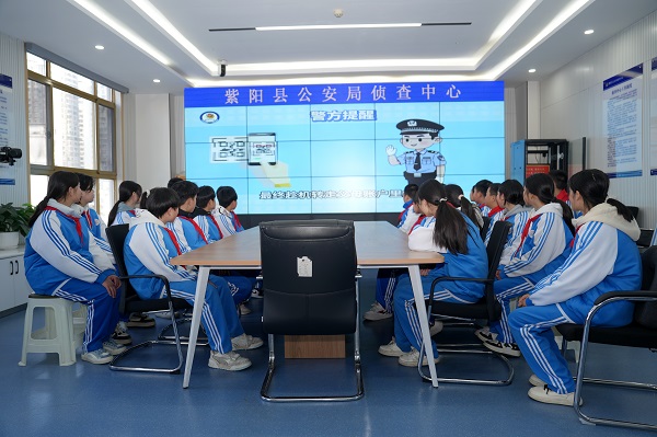 学生们在局机关大厅观看了《十子工作法》专题片,见证了该局4年6获公安部表彰表扬背后广大民辅警的忠诚守护,感受到了紫阳警营里的热血荣光。