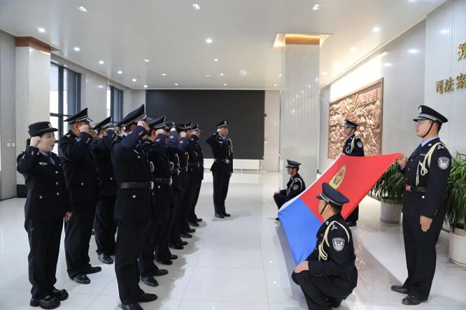 上午9时,庆祝活动在庄严的升旗仪式中拉开帷幕。升旗仪式结束后,全体司法警察庄严列队,面朝警旗,右手举拳,以庄重饱满的精神状态,重温入警誓词,铿锵有力的誓言字字千钧、掷地有声,既是对初心使命的重温坚守,更是对司法责任的庄严承诺。