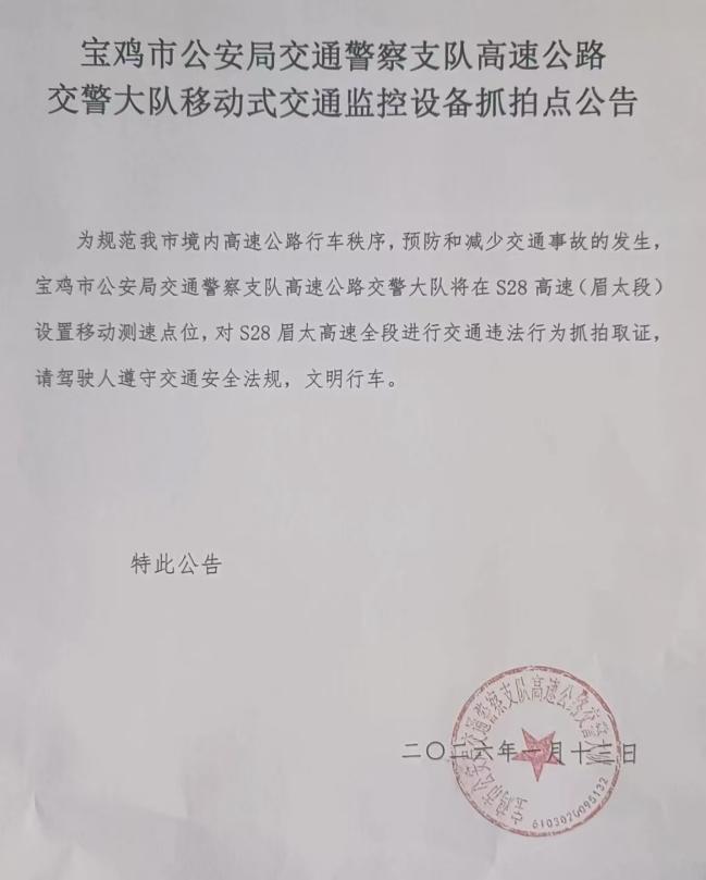 1月13日,宝鸡市公安局交通警察支队高速公路交警大队发布公告,为规范S28眉太高速行车秩序、减少交通事故,将在该路段设置移动式交通监控测速点位,对全段交通违法行为开展抓拍取证工作。