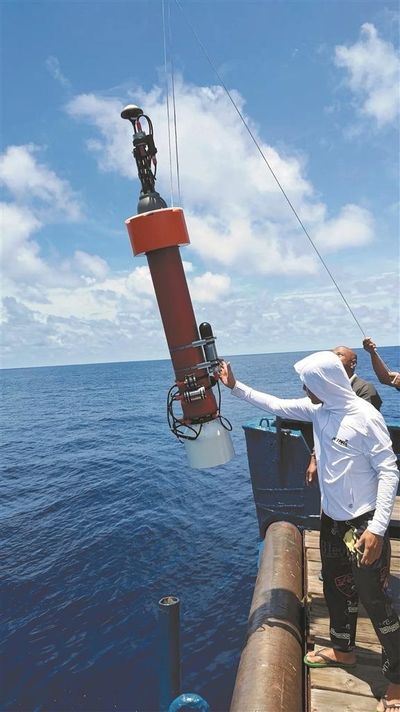 海洋生物地球化学原位传感器搭载Argo浮标海试布放现场(资料照片)。受访者供图