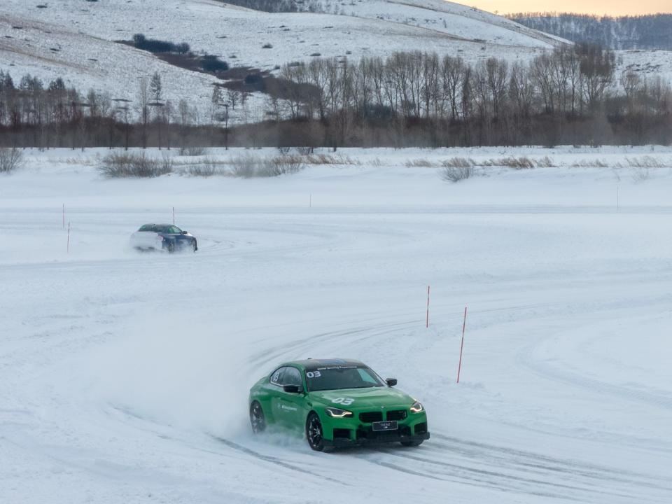 在内蒙古呼伦贝尔市牙克石市一处汽车测试基地,车手在冰面上驾驶车辆