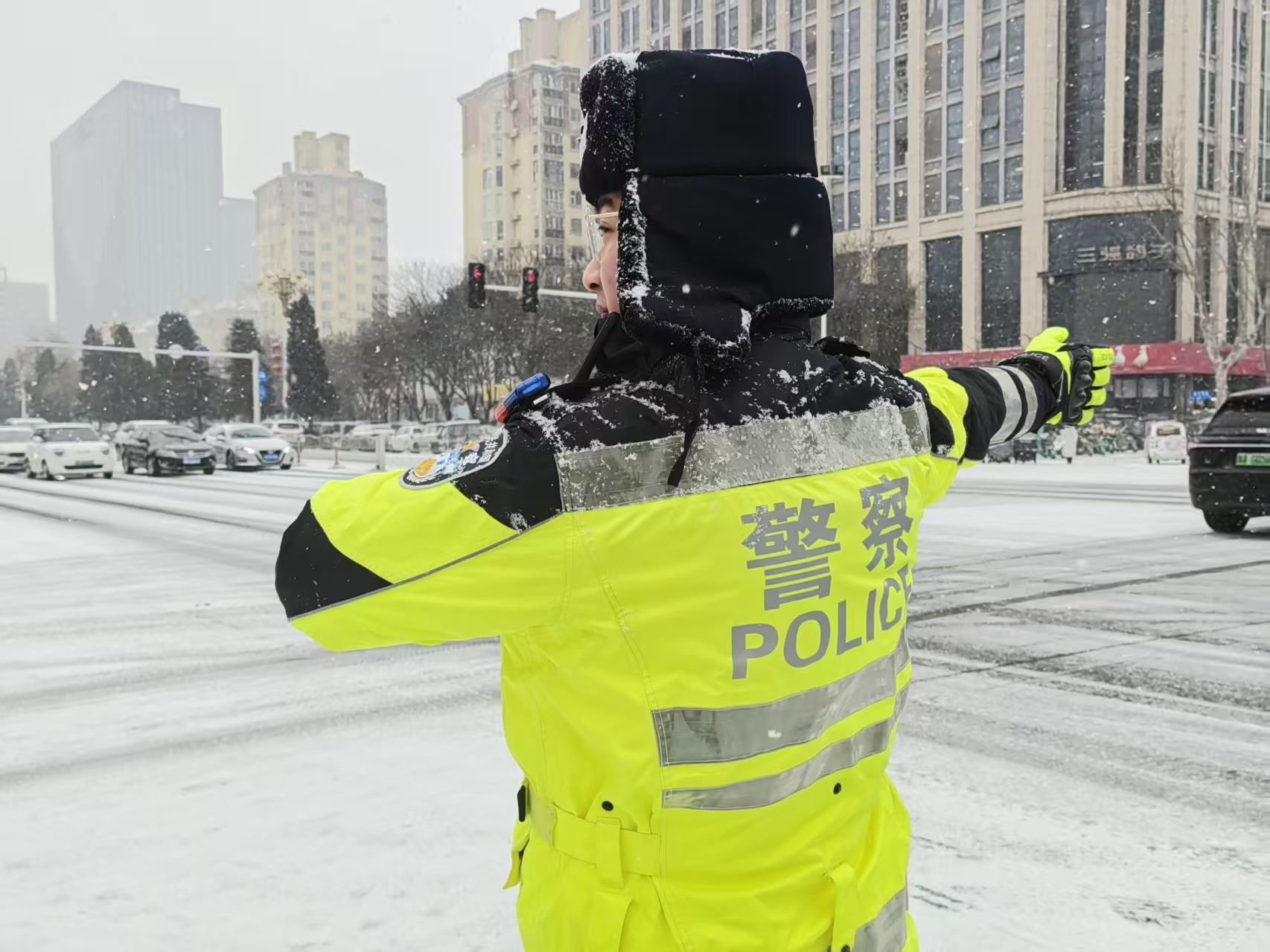 交警支队上下齐心协力,积极采取有效措施,全体民辅警不畏严寒,坚守在执勤一线,不叫苦,不叫累,不退缩,一边是雪景,一边是“雪警”,风雪见证担当,行动诠释职责,用责任和担当筑牢安全防线,一抹抹“荧光黄”守望平安,一幕幕救助画面感人心扉,一个个忙碌的身影,帽檐、衣领上点缀的星星雪花,“荧光黄”已悄然成为一道别样的风景,温暖慰藉着顶风冒雪出行的群众。(袁飞 王宝玉)