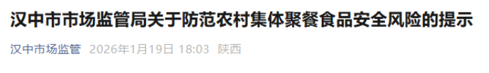 随着 2026年春节临近,汉中市农村集体聚餐活动日益增多。为防范食品安全风险,预防食物中毒事故和食源性疾病发生,保障群众身体健康和生命安全,1月19日汉中市市场监管局依据相关法律法规,发布了农村集体聚餐食品安全风险提示。
