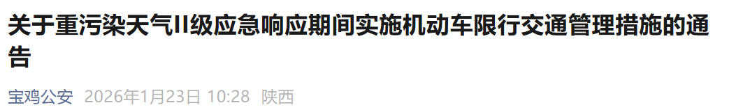 近日,宝鸡市公安局交通管理支队发布通告,自1月24日9时起,在重污染天气II级应急响应期间实施机动车限行交通管理措施,直至应急响应终止。