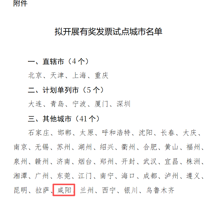 近日,商务部、财政部、国家税务总局联合公示了拟开展有奖发票试点的城市名单,全国共有50个城市拟入选,咸阳名列其中。这意味着,未来在咸阳进行日常消费并索要发票,将有机会参与抽奖,单张发票奖金最高可达800元。