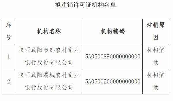 近日,国家金融监督管理总局咸阳监管分局发布公告,依法注销陕西咸阳秦都农村商业银行股份有限公司、陕西咸阳渭城农村商业银行股份有限公司的《保险中介许可证》,两机构不得继续开展保险代理业务。
