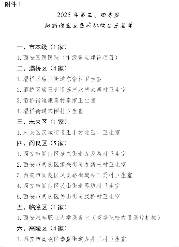 近日,西安市医疗保障局发布通告,2025年第三、四季度新增定点医疗机构申报、评估工作已完成,将拟通过的22家定点医疗机构名单予以公示。