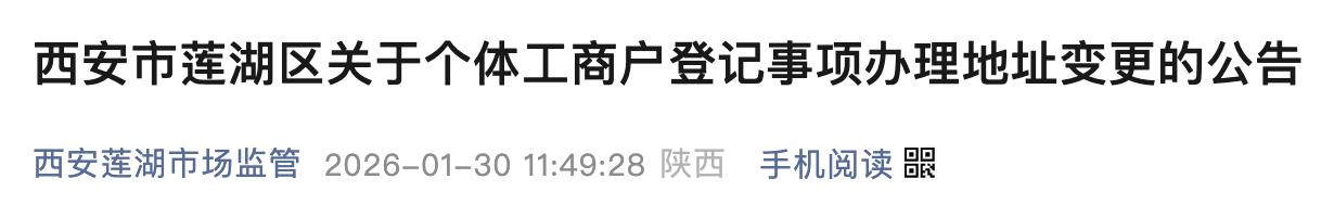 此次调整自2026年2月9日起实施,调整涵盖全区各市场监管所(青年路、北院门、环城西路、西关、土门、红庙坡、桃园路、枣园、北关)和重点食品市场监督管理所办理的个体工商户登记注册相关业务,具体包括个体工商户注册、个体工商户变更、个体工商户注销。