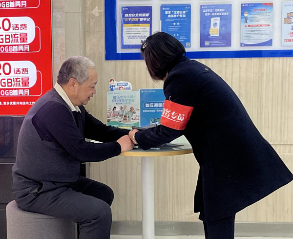 爱心专区有“爱心服务专员”值守,他们不仅耐心解答业务咨询,更主动为前来办理业务的中老年客户提供免费血压测量服务,并细心记录健康状况,让服务窗口也成为健康关怀的驿站。从一杯温水、一副老花镜,到一句耐心的讲解、一次贴心的指导,西安移动营业厅致力于打破数字鸿沟,将“便老、适老、助老”理念落到实处。