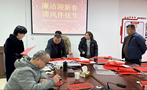 春节将至,年味渐浓。为弘扬中华优秀传统文化,营造风清气正、欢乐祥和的节日氛围,2月4日,高新区产业发展投资有限公司党支部联合工会组织开展“廉洁迎新春,清风伴佳节”写春联送温暖主题活动。活动将廉洁文化与新春祝福相结合,以翰墨书香传递清风正气。