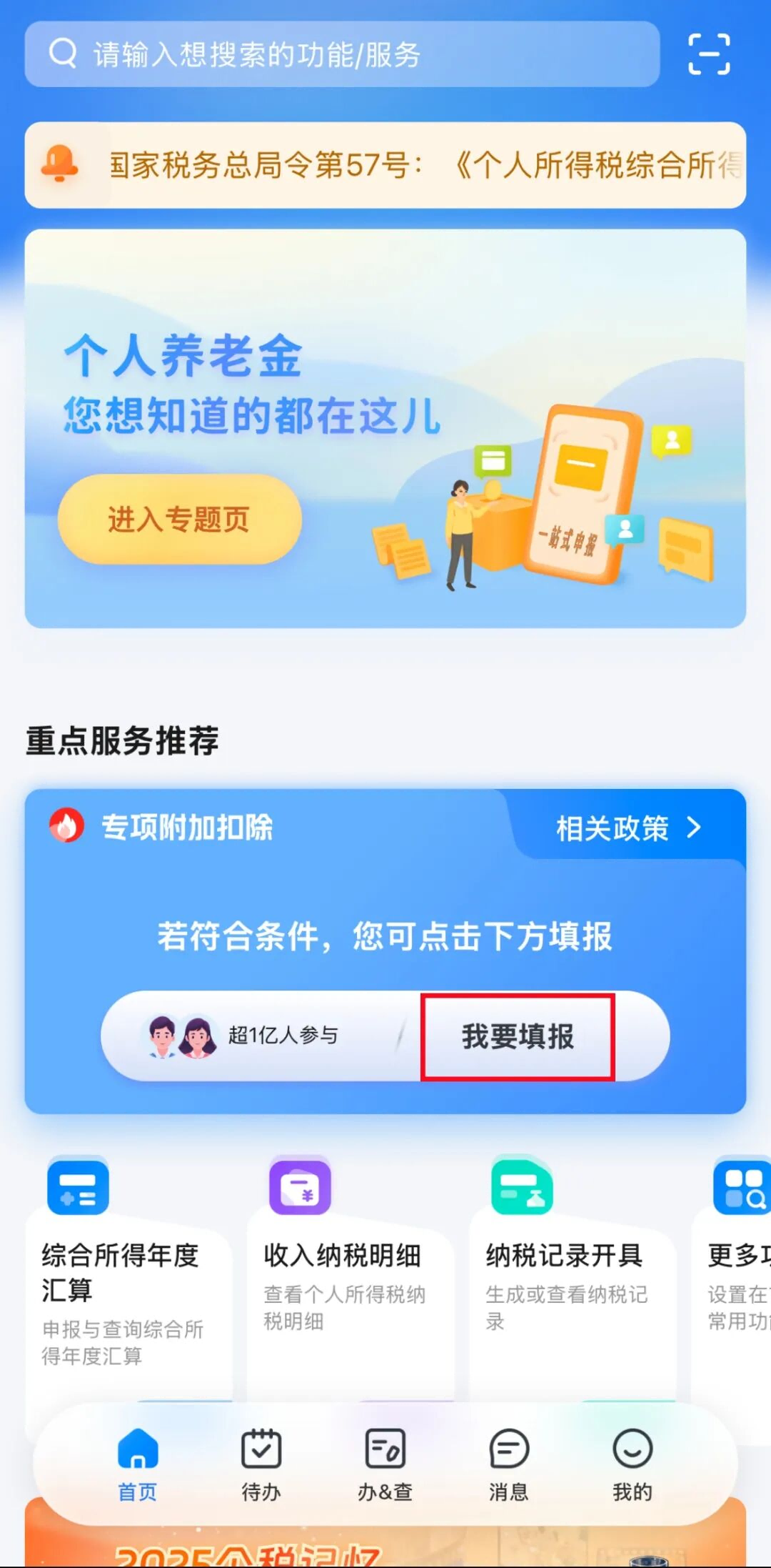 打开个人所得税App,在首页点击【我要填报】。登录后跳转至“专项附加扣除”填报界面,点击需要补充填报的专项附加扣除项目,例如继续教育。