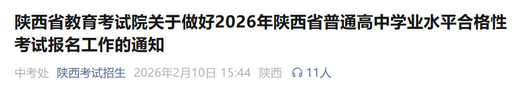 2月10日,陕西省教育考试院发布通知,2026年普通高中学业水平合格性考试(简称“合格考”)报名工作即将启动。本次考试定于2026年5月11日至13日举行,报名时间为3月9日8:00至3月16日18:00,逾期不再受理。