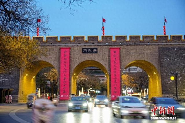 近日,西安城墙永宁门、长乐门、和平门等16座城门完成巨幅春联悬挂工作。红底浓墨映着千年城砖,与雄伟的古城墙交相辉映,将古城西安装扮得喜气洋洋。