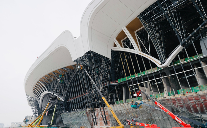 步入西安东站建设现场,站房雏形初显恢宏大气,独特的造型设计让人眼前一亮。中铁建设集团在西安东站建设中主要负责站房主体结构、金属屋面及装饰装修施工任务,其承建的光电玻璃幕墙施工,更是为这份美感添彩的同时,成为工程推进中的重点与难点。