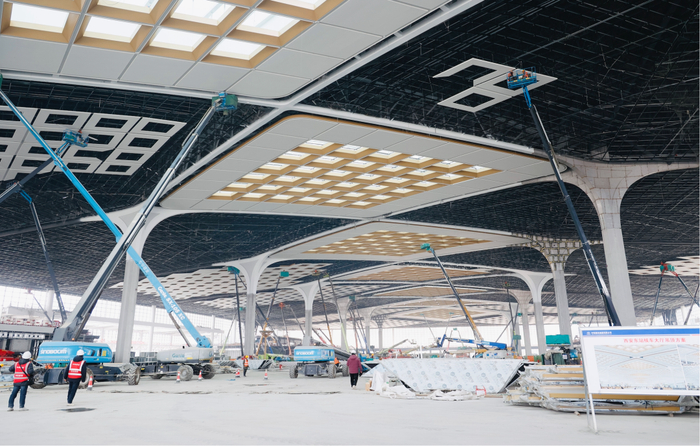 为保障每块玻璃精准安装,中铁建设集团西安东站项目团队应用三维建模及北斗高清全站仪技术,精准定位超1300个三维坐标点位。“我们将每一个龙骨坐标点位的误差值严格控制在毫米级,确保春节期间104块全异形光电玻璃顺利安装。”中铁建设集团项目总工程师刘健介绍,目前该单位已完成16万平方米混凝土结构、15000吨钢结构、7万平方米金属屋面施工任务,为站房如期具备通车条件筑牢基础。