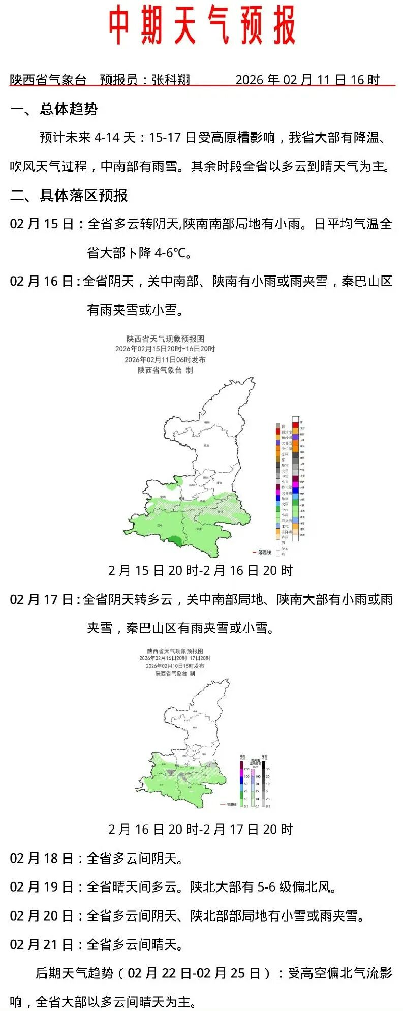 陕西省气象台2月11日16时发布中期天气预报,未来三天,陕西省以晴到多云天气为主,气温略有回升。预计未来4-14天:15-17日受高原槽影响,陕西省大部有降温、吹风天气过程,中南部有雨雪。其余时段全省以多云到晴天气为主。