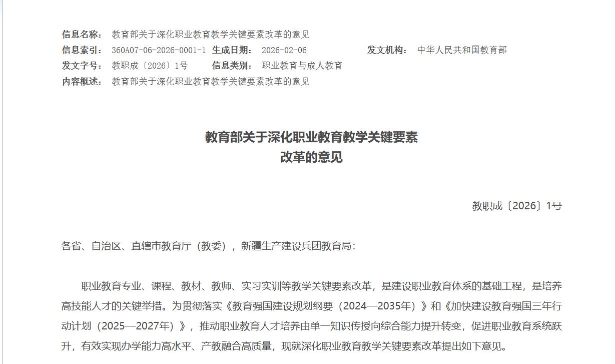 近日,教育部印发《关于深化职业教育教学关键要素改革的意见》(以下简称《意见》),全面部署各地、各职业学校开展专业、课程、教材、教师、实习实训等教学关键要素联动改革,推动人才培养由传统知识传授向综合能力提升转变,促进职业教育系统性跃升,有效实现办学能力高水平、产教融合高质量,形成职业教育高技能人才培养生态。一张图带您了解《意见》内容↓↓↓