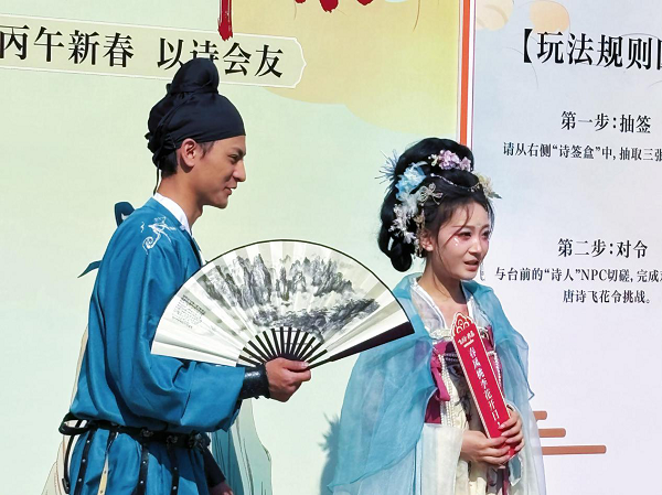 在“诗客”NPC设下“飞花令”对诗活动中,大家围绕“春”“花”等主题与游客即兴对答,一句“桃花依旧笑春风”引得孩童脱口接续,文脉传承尽显其中。