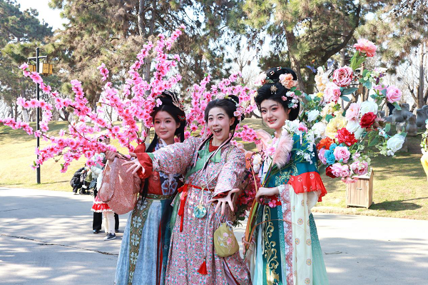 活动现场,舞者们用大型唐风舞蹈“霓裳贺岁”为游客带去新春祝福,水袖翩跹、鼓点铿锵,赢得现场观众阵阵掌声。“花间巡游”活动中,“花仙子”“采花女”于花径间穿行,与游客赠花互动、合影留念,营造出“花不离人、人不负春”的绝美场景。