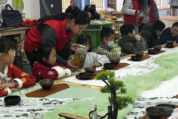 活动现场氛围雅致,茶席整齐摆放,茶香与新春喜庆气息交融。活动中,专业茶艺老师首先引导孩子们放松身心,随后用通俗生动的语言,向孩子们讲解传统茶艺文化、茶具工艺用途等知识,传递“以茶敬人、以礼待人”的传统美德。志愿者们全程协助,为孩子们添茶,配合老师指导孩子们品味茶香、规范操作。孩子们神情专注、认真投入,在茶香悠韵中感受茶艺礼仪之美,不仅培养了专注力和审美情趣,也引导孩子们深入了解了中国传统茶文化。