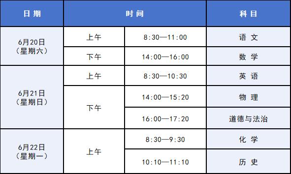 九年级笔试科目考试时间为6月20日上午至6月22日上午,八年级的考试时间为6月22日下午。八年级学生信息科技上机操作考试和生物学实验操作考试在5月份完成。九年级学生物理和化学实验操作考试在5月份完成。九年级学生体育与健康现场考试在5月份完成。