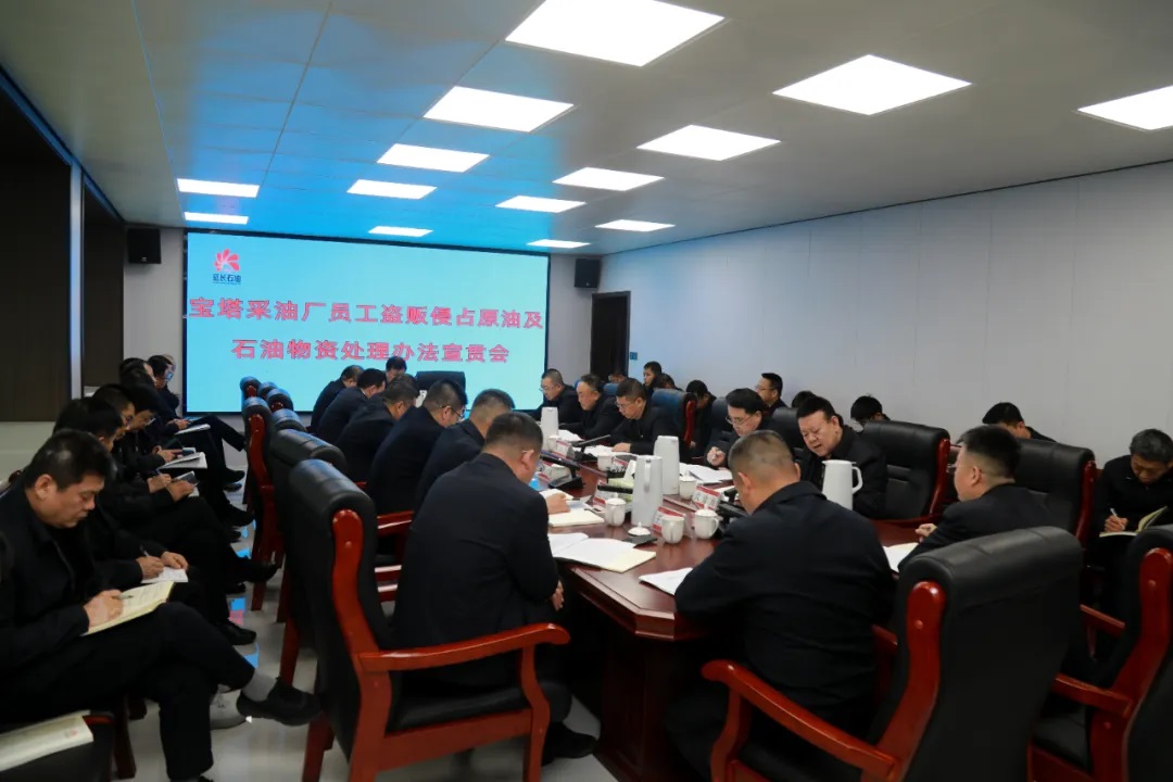 为坚决维护企业资产安全、筑牢油区法治防线,切实防范遏制盗贩、侵占原油及石油物资等违规违纪违法行为,3月2日,延长油田公司宝塔采油厂组织召开《延长油田股份有限公司员工盗贩原油及物资处理办法》宣贯会,对制度条款、处置流程、责任追究与工作要求进行全面解读和部署,推动制度入脑入心、落地见效。采油厂领导班子成员及各单位负责人参加。