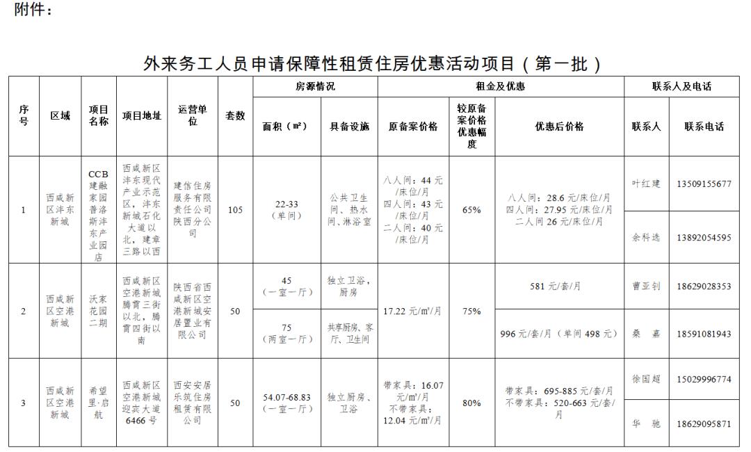 3月3日,西西新闻记者从西安市住房和城乡建设局获悉,在西安市工作的外来务工人员申请保障性租赁住房优惠活动项目,可享受价格折扣、先住后审、单位整租等政策。