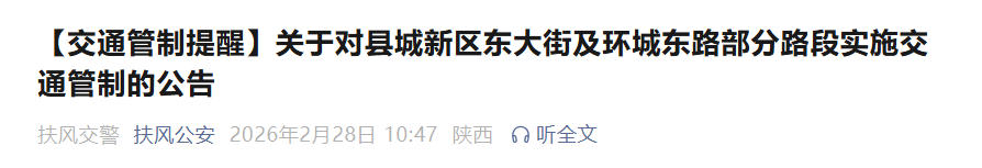 据宝鸡扶风县相关部门公告,该县县城新区及法门镇两处路段将先后实施交通管制,其中县城新区管制措施已自3月1日开始执行。