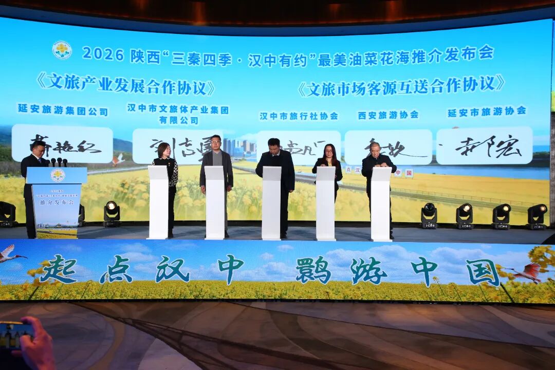 春回三秦,万象更新。会上,汉中市文化和旅游局与西安市、延安市文化和旅游局签订了《文旅战略合作协议》,汉中市文旅体产业集团有限公司与延安旅游集团公司签订了《文旅产业发展合作协议》,这是汉中深化与兄弟地市交流合作,推动汉中与西安协同发展、促进陕南陕北区域协作;汉中市旅行社协会与西安、延安旅游协会签订了《文旅市场客源互送合作协议》,吸引更多省内游客走进汉中、赏花踏春,开启一场花海与历史的千年相逢。