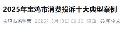 3月13日,宝鸡市市场监督管理局公布2025年宝鸡市消费投诉十大典型案例,内容如下:
