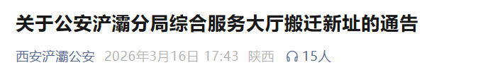 办理户政、出入境等公安业务请注意!3月16日,西安市公安局浐灞国际港分局发布公告称,该局综合服务大厅将于本月下旬搬迁至新址,原大厅将于3月22日下午5时起停止服务,新大厅将于3月26日正式对外开放,为广大市民提供“一站式”公安政务服务。