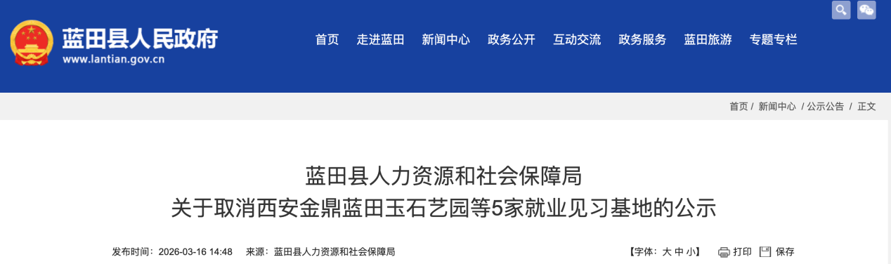 3月16日,蓝田县人力资源和社会保障局消息称,取消西安金鼎蓝田玉石艺园等5家就业见习基地资格。此次公示期为5个工作日,自3月16日-3月20日。