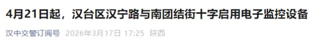 近日,汉中市公安局交通管理支队三大队发布公告,为进一步加强和改善辖区道路交通环境,将于2026年4月21日0时,在汉台区汉宁路与南团结街十字正式启用1套电子监控违法自动记录设备。