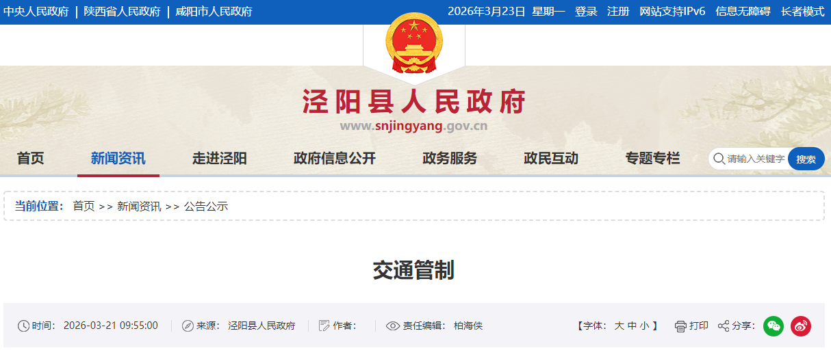 3月20日,咸阳市泾阳县公安局交通管理大队、泾阳县交通运输局、陕西交控西安外环分公司高陵路产养护管理中心联合发布通告,因泾三路K3+800处上跨临兴高速立交桥水毁修复,施工期间将对相关路段实行交通管制。
