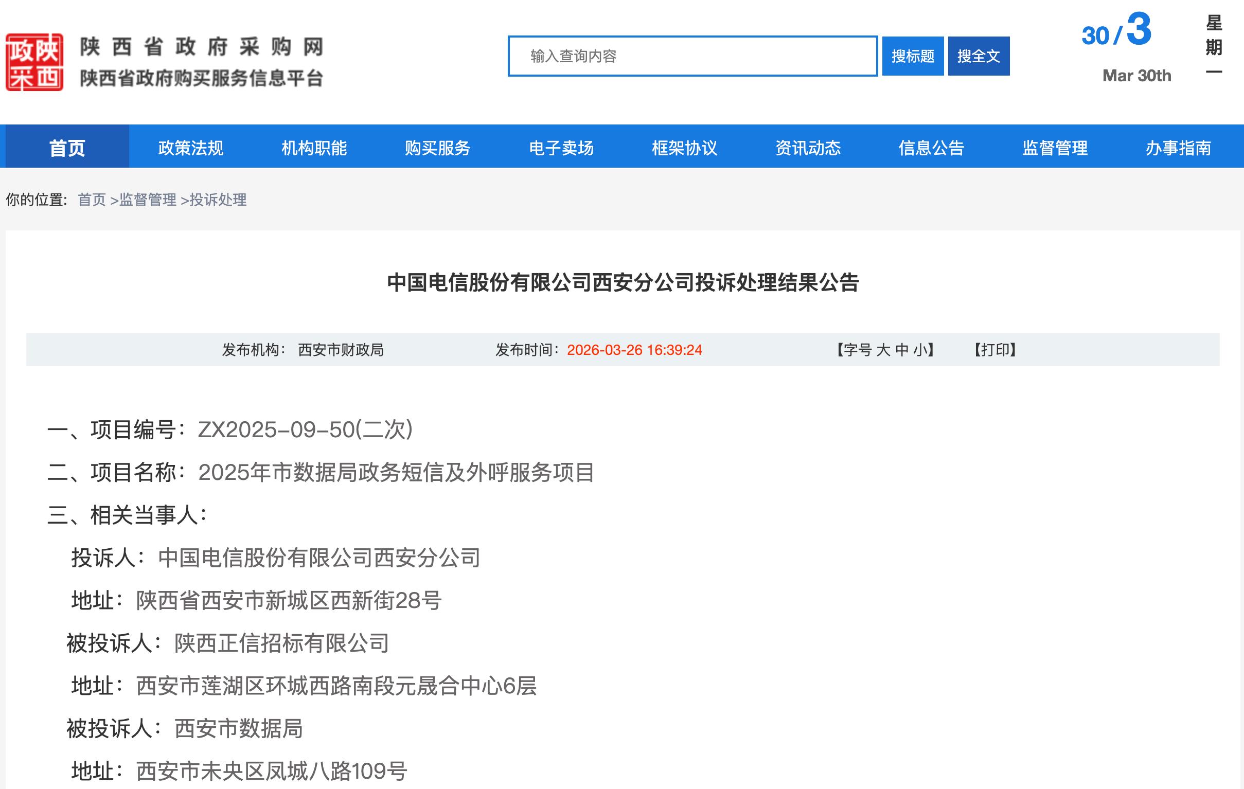 该公告显示,2026年3月3日,西安市财政局受理中国电信股份有限公司西安分公司的一项投诉。在西安市数据局2025年政务短信及外呼服务项目(二次)(项目编号:ZX2025-09-50)采购中,陕西正信招标有限公司对“核心资质审查未严格执行”的质疑答复缺乏合法依据,违规认定未加盖公章的资质文件通过资格审查,损害政府采购公平性。
