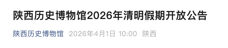 4月1日,陕西历史博物馆发布公告,2026年清明假期(4月4日—6日)开放时间有调整。