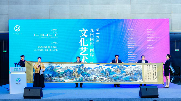 开幕式上,西安市碑林区铁五小学童声合唱团演唱文化艺术展主题曲《陕台秦思》,陕台书画艺术家代表展示共创作品长卷《山水相拥 同根同源》。