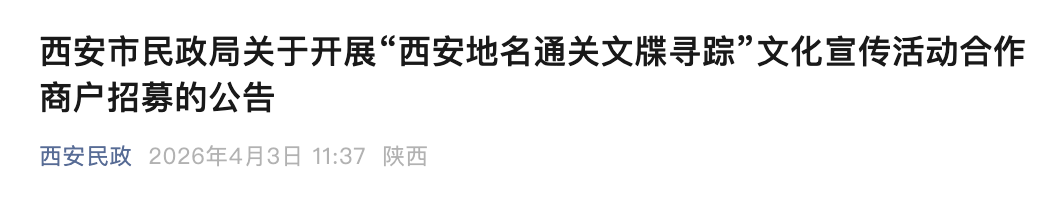 近日,西安市民政局发布消息称,为更好地弘扬和宣传西安深厚悠久的地名文化,该局计划于2026年7月—10月,联合相关行业协会(商会)开展首批“西安地名通关文牒寻踪”公益宣传活动。