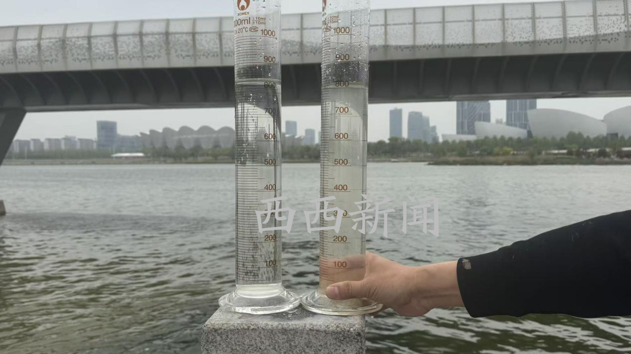 现场取样:再生水样本相较于河水样本清澈